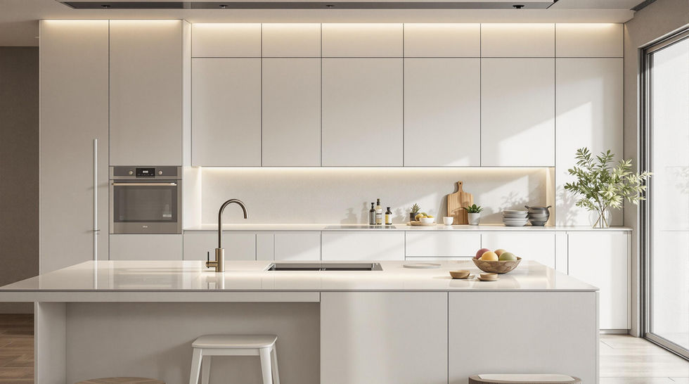 A sleek, contemporary kitchen design focusing on clean lines and simplicity. Key elements include handleless cabinets, integrated appliances, and innovative pull-out storage systems, maximizing utility in a bright, open layout.